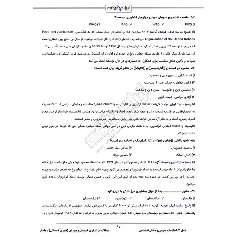 سوالات استخدامی سرایداری آموزش و پرورش (نیروی خدماتی) شامل 1063 سوال با پاسخنامه تشریحی به شرح زیر: فصل 1: سوالات معارف اسلامی (دوره متوسطه دوم) - صفحه 6 (100 سوال) فصل 2: سوالات زبان و ادبیات فارسی (دوره متوسطه دوم) - صفحه 46 (100 سوال) فصل 3: سوالات اطلاعات عمومی و دانش اجتماعی (دوره متوسطه دوم) - صفحه 71 (100 سوال) فصل 4: سوالات قوانین و مقررات اداری و قانون اساسی - صفحه 99 بخش 1: قانون اساسی (100 سوال) بخش 2: وصیت نامه الهی سیاسی حضرت امام خمینی (ره) (100 سوال) بخش 3: بیانیه گام دوم انقلاب اسلامی (96 سوال) بخش 4: قانون مدیریت خدمات کشوری (68 سوال) فصل 5: سوالات ریاضی و آمار مقدماتی (دوره متوسطه دوم) - صفحه 190 (100 سوال) فصل 6: سوالات توانمندی های ذهنی و ویژگی های رفتاری - صفحه 222 (100 سوال) فصل 7: سوالات زبان انگلیسی (دوره متوسطه دوم) - صفحه 263 (100 سوال) فصل 8: سوالات فناوری اطلاعات (مهارت های هفتگانه ICDL) - صفحه 295 (100 سوال) فصل 9: سوالات معارف اهل تسنن تالیف ایران عرضه (دوره متوسطه دوم) - صفحه 329 (100 سوال) |