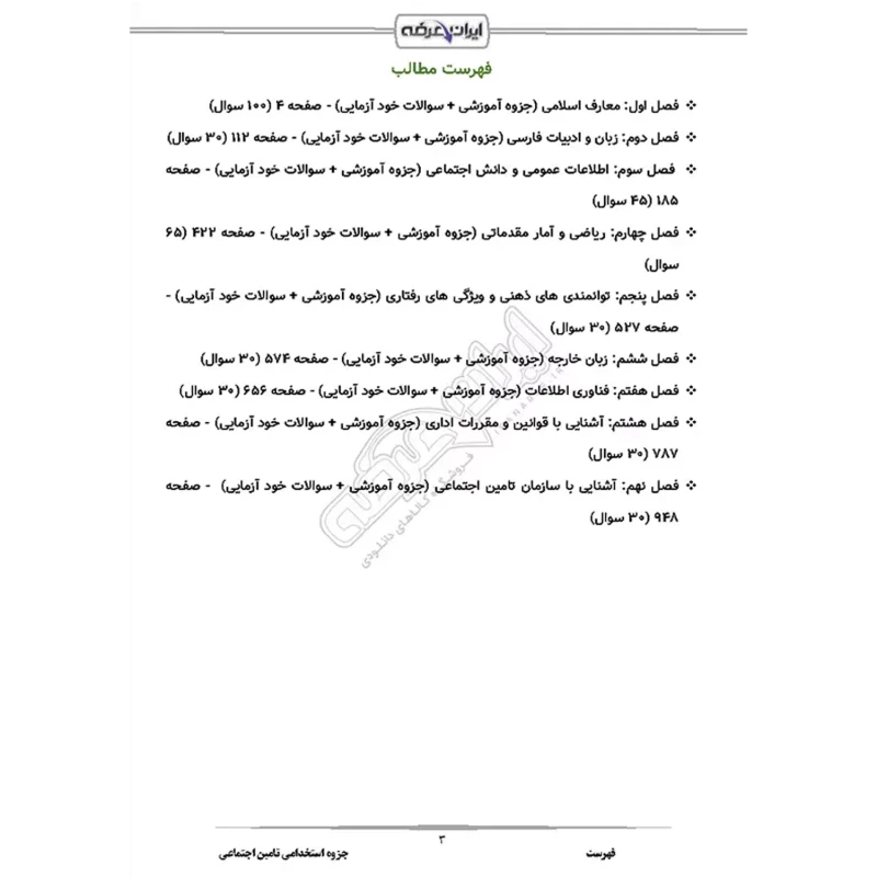 جزوه استخدامی تامین اجتماعی شامل 943 صفحه به شرح زیر: فصل 1: معارف اسلامی (جزوه آموزشی + سوالات خود آزمایی) - صفحه 4 (100 سوال) فصل 2: زبان و ادبیات فارسی (جزوه آموزشی + سوالات خود آزمایی) - صفحه 112 (30 سوال) فصل 3: اطلاعات عمومی و دانش اجتماعی (جزوه آموزشی + سوالات خود آزمایی) - صفحه 184 (45 سوال) فصل 4: ریاضی و آمار مقدماتی (جزوه آموزشی + سوالات خود آزمایی) - صفحه 419 (65 سوال) فصل 5: توانمندی های ذهنی و ویژگی های رفتاری (جزوه آموزشی + سوالات خود آزمایی) - صفحه 523 (30 سوال) فصل 6: زبان خارجه (جزوه آموزشی + سوالات خود آزمایی) - صفحه 570 (47 سوال) فصل 7: فناوری اطلاعات (جزوه آموزشی + سوالات خود آزمایی) - صفحه 630 (30 سوال) فصل 8: آشنایی با قوانین و مقررات اداری (جزوه آموزشی + سوالات خود آزمایی) - صفحه 758 (30 سوال) فصل 9: آشنایی با سازمان تامین اجتماعی (جزوه آموزشی + سوالات خود آزمایی) - صفحه 917 (30 سوال) |