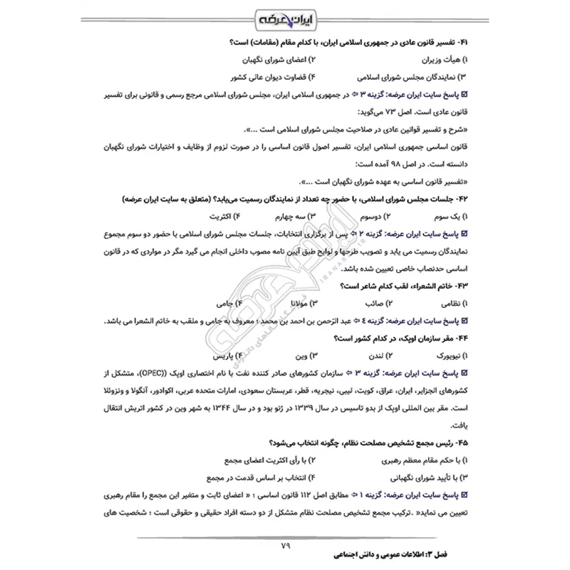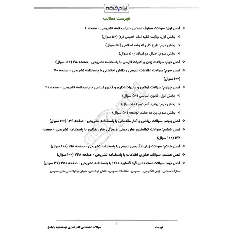 سوالات استخدامی کادر اداری قوه قضاییه شامل 930 سوال با پاسخنامه تشریحی به شرح زیر: فصل 1: سوالات معارف اسلامی - صفحه 4 بخش 1: ولایت فقیه امام خمینی (ره) (50 سوال) بخش 2: طرح کلی اندیشه اسلامی (50 سوال) بخش 3: جدال دو اسلام (50 سوال) فصل 2: سوالات زبان و ادبیات فارسی - صفحه 45 (100 سوال) فصل 3: سوالات اطلاعات عمومی و دانش اجتماعی - صفحه 70 (100 سوال) فصل 4: سوالات قوانین و مقررات اداری و قانون اساسی - صفحه 91 بخش 1: قانون اساسی (50 سوال) بخش 2: بیانیه گام دوم (50 سوال) بخش 3: برنامه هفتم توسعه (50 سوال) فصل 5: سوالات ریاضی و آمار مقدماتی - صفحه 136 (100 سوال) فصل 6: سوالات توانمندی های ذهنی و ویژگی های رفتاری - صفحه 162 (100 سوال) فصل 7: سوالات زبان انگلیسی عمومی - صفحه 198 (100 سوال) فصل 8: سوالات فناوری اطلاعات - صفحه 228 (100 سوال) فصل 9: سوالات استخدامی قوه قضاییه 1400 - صفحه 250 (30 سوال) معارف اسلامی - زبان انگلیسی – عمومی - اطلاعات عمومی، دانش اجتماعی، هوش و توانمندی های عمومی |