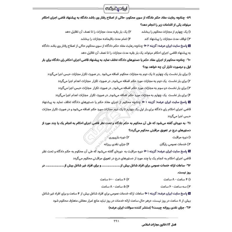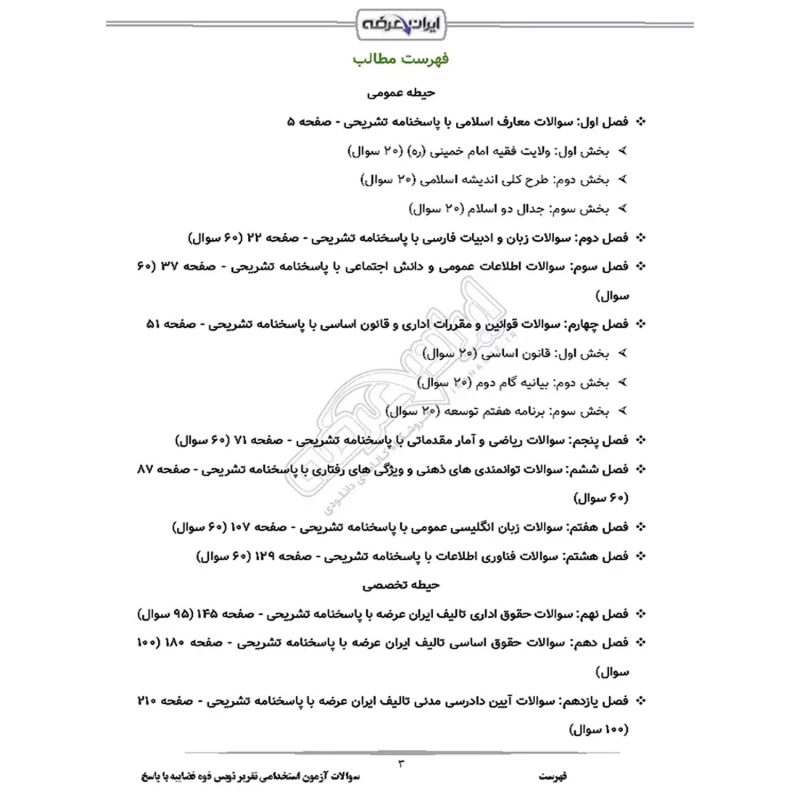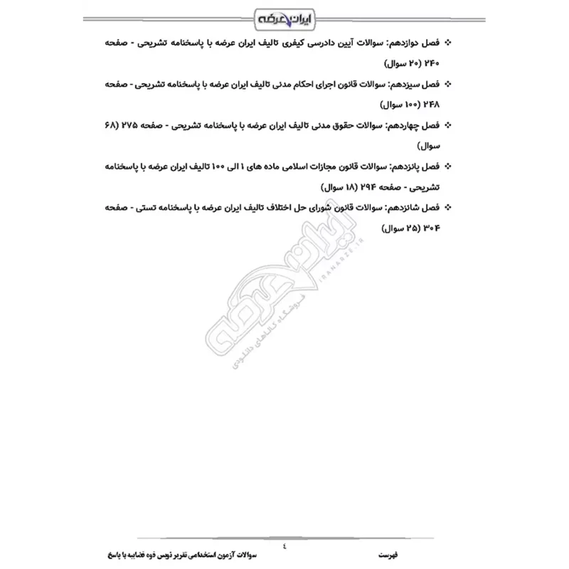سوالات آزمون استخدامی تقریر نویس قوه قضاییه شامل 1006 سوال با پاسخنامه تشریحی به شرح زیر: حیطه عمومی فصل اول: سوالات معارف اسلامی - صفحه 5 بخش 1: ولایت فقیه امام خمینی (ره) (20 سوال) بخش 2: طرح کلی اندیشه اسلامی (20 سوال) بخش 3: جدال دو اسلام (20 سوال) فصل 2: سوالات زبان و ادبیات فارسی - صفحه 22 (60 سوال) فصل 3: سوالات اطلاعات عمومی و دانش اجتماعی - صفحه 37 (60 سوال) فصل 4: سوالات قوانین و مقررات اداری و قانون اساسی - صفحه 51 بخش 1: قانون اساسی (20 سوال) بخش 2: بیانیه گام دوم (20 سوال) بخش 3: برنامه هفتم توسعه (20 سوال) فصل 5: سوالات ریاضی و آمار مقدماتی - صفحه 71 (60 سوال) فصل 6: سوالات توانمندی های ذهنی و ویژگی های رفتاری - صفحه 87 (60 سوال) فصل 7: سوالات زبان انگلیسی عمومی - صفحه 107 (60 سوال) فصل 8: سوالات فناوری اطلاعات - صفحه 129 (60 سوال) حیطه تخصصی فصل 9: سوالات حقوق اداری تالیف ایران عرضه - صفحه 145 (95 سوال) فصل 10: سوالات حقوق اساسی تالیف ایران عرضه - صفحه 180 (100 سوال) فصل 11: سوالات آیین دادرسی مدنی تالیف ایران عرضه - صفحه 210 (100 سوال) فصل 12: سوالات آیین دادرسی کیفری تالیف ایران عرضه - صفحه 240 (20 سوال) فصل 13: سوالات قانون اجرای احکام مدنی تالیف ایران عرضه - صفحه 248 (100 سوال) فصل 14: سوالات حقوق مدنی تالیف ایران عرضه - صفحه 275 (68 سوال) فصل 15: سوالات قانون مجازات اسلامی ماده های 1 الی 100 تالیف ایران عرضه - صفحه 294 (18 سوال) فصل 16: سوالات قانون شورای حل اختلاف تالیف ایران عرضه با پاسخنامه تستی - صفحه 304 (25 سوال) |