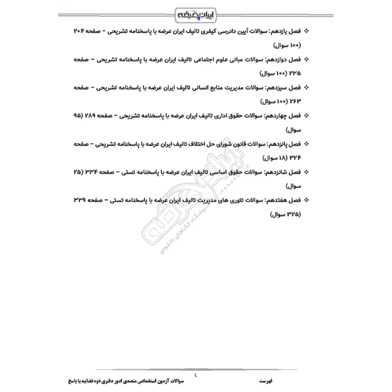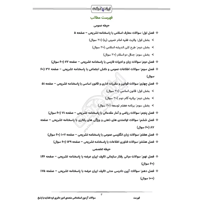 سوالات آزمون استخدامی متصدی امور دفتری قوه قضاییه شامل 1197 سوال با پاسخنامه تشریحی به شرح زیر: حیطه عمومی فصل 1: سوالات معارف اسلامی - صفحه 5 بخش 1: ولایت فقیه امام خمینی (ره) (20 سوال) بخش 2: طرح کلی اندیشه اسلامی (20 سوال) بخش 3: جدال دو اسلام (20 سوال) فصل 2: سوالات زبان و ادبیات فارسی - صفحه 22 (60 سوال) فصل 3: سوالات اطلاعات عمومی و دانش اجتماعی - صفحه 37 (60 سوال) فصل 4: سوالات قوانین و مقررات اداری و قانون اساسی - صفحه 51 بخش 1: قانون اساسی (20 سوال) بخش 2: بیانیه گام دوم (20 سوال) بخش 3: برنامه هفتم توسعه (20 سوال) فصل 5: سوالات ریاضی و آمار مقدماتی - صفحه 71 (60 سوال) فصل 6: سوالات توانمندی های ذهنی و ویژگی های رفتاری - صفحه 87 (60 سوال) فصل 7: سوالات زبان انگلیسی عمومی - صفحه 107 (60 سوال) فصل 8: سوالات فناوری اطلاعات - صفحه 129 (60 سوال) حیطه تخصصی فصل 9: سوالات مبانی رفتار سازمانی تالیف ایران عرضه - صفحه 146 (60 سوال) فصل 10: سوالات آیین دادرسی مدنی تالیف ایران عرضه - صفحه 175 (100 سوال) فصل 11: سوالات آیین دادرسی کیفری تالیف ایران عرضه - صفحه 204 (100 سوال) فصل 12: سوالات مبانی علوم اجتماعی تالیف ایران عرضه - صفحه 235 (100 سوال) فصل 13: سوالات مدیریت منابع انسانی تالیف ایران عرضه - صفحه 264 (100 سوال) فصل 14: سوالات حقوق اداری تالیف ایران عرضه - صفحه 290 (95 سوال) فصل 15: سوالات قانون شورای حل اختلاف تالیف ایران عرضه - صفحه 325 (18 سوال) فصل 16: سوالات حقوق اساسی تالیف ایران عرضه - صفحه 335 (84 سوال) فصل 17: سوالات تئوری های مدیریت تالیف ایران عرضه - صفحه 366 (60 سوال) |
