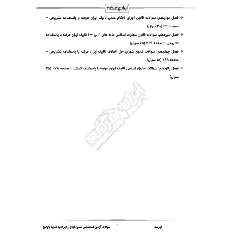 سوالات آزمون استخدامی کارشناس مسئول ابلاغ و اجرا قوه قضاییه شامل 906 سوال با پاسخنامه تشریحی به شرح زیر: حیطه عمومی فصل 1: سوالات معارف اسلامی – صفحه 5 بخش 1: ولایت فقیه امام خمینی (ره) (20 سوال) بخش 2: طرح کلی اندیشه اسلامی (20 سوال) بخش 3: جدال دو اسلام (20 سوال) فصل 2: سوالات زبان و ادبیات فارسی – صفحه 22 (60 سوال) فصل 3: سوالات اطلاعات عمومی و دانش اجتماعی – صفحه 37 (60 سوال) فصل 4: سوالات قوانین و مقررات اداری و قانون اساسی – صفحه 51 بخش 1: قانون اساسی (20 سوال) بخش 2: بیانیه گام دوم (20 سوال) بخش 3: برنامه هفتم توسعه (20 سوال) فصل 5: سوالات ریاضی و آمار مقدماتی – صفحه 71 (60 سوال) فصل 6: سوالات توانمندی های ذهنی و ویژگی های رفتاری – صفحه 87 (60 سوال) فصل 7: سوالات زبان انگلیسی عمومی – صفحه 107 (60 سوال) فصل 8: سوالات فناوری اطلاعات – صفحه 129 (60 سوال) حیطه تخصصی فصل 9: سوالات حقوق اداری تالیف ایران عرضه – صفحه 146 (95 سوال) فصل 10: سوالات آیین دادرسی مدنی تالیف ایران عرضه – صفحه 181 (100 سوال) فصل 11: سوالات آیین دادرسی کیفری تالیف ایران عرضه – صفحه 210 (100 سوال) فصل 12: سوالات قانون اجرای احکام مدنی تالیف ایران عرضه – صفحه 241 (20 سوال) فصل 13: سوالات قانون مجازات اسلامی ماده های 1 الی 100 تالیف ایران عرضه با – صفحه 249 (68 سوال) فصل 14: سوالات قانون شورای حل اختلاف تالیف ایران عرضه – صفحه 268 (18 سوال) فصل 15: سوالات حقوق اساسی تالیف ایران عرضه با پاسخنامه تستی – صفحه 278 (25 سوال) |