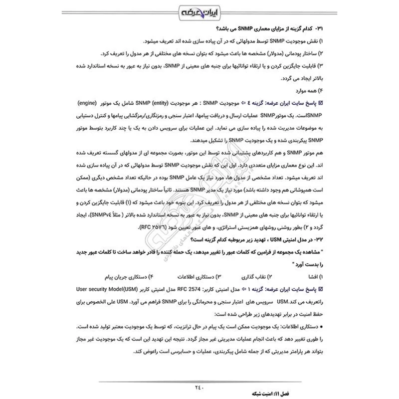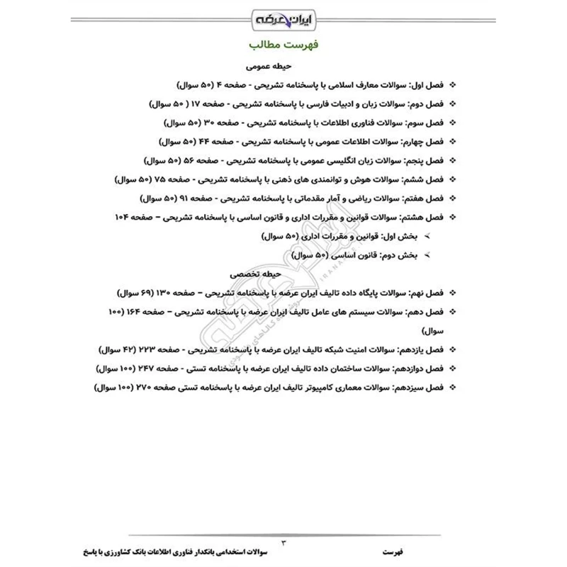 سوالات استخدامی بانکدار فناوری اطلاعات بانک کشاورزی شامل 861 سوال با پاسخنامه تشریحی: حیطه عمومی فصل 1: سوالات معارف اسلامی - صفحه 4 (50 سوال) فصل 2: سوالات زبان و ادبیات فارسی - صفحه 17 ( 50 سوال) فصل 3: سوالات فناوری اطلاعات - صفحه 30 (50 سوال) فصل 4: سوالات اطلاعات عمومی - صفحه 44 (50 سوال) فصل 5: سوالات زبان انگلیسی عمومی - صفحه 56 (50 سوال) فصل 6: سوالات هوش و توانمندی های ذهنی - صفحه 75 (50 سوال) فصل 7: سوالات ریاضی و آمار مقدماتی - صفحه 91 (50 سوال) فصل 8: سوالات قوانین و مقررات اداری و قانون اساسی – صفحه 104 بخش اول: قوانین و مقررات اداری (50 سوال) بخش دوم: قانون اساسی (50 سوال) حیطه تخصصی فصل 9: سوالات پایگاه داده تالیف ایران عرضه با پاسخنامه تشریحی – صفحه 130 (69 سوال) فصل 10: سوالات سیستم های عامل تالیف ایران عرضه با پاسخنامه تشریحی – صفحه 164 (100 سوال) فصل 11: سوالات امنیت شبکه تالیف ایران عرضه با پاسخنامه تشریحی - صفحه 223 (42 سوال) فصل 12: سوالات ساختمان داده تالیف ایران عرضه با پاسخنامه تستی - صفحه 247 (100 سوال) فصل 13: سوالات معماری کامپیوتر تالیف ایران عرضه با پاسخنامه تستی صفحه 270 (100 سوال) |