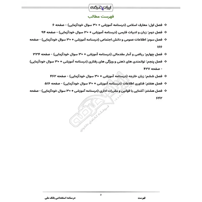 جزوه استخدامی بانک ملی شامل 800 صفحه به شرح زیر: فصل 1: معارف اسلامی (درسنامه آموزشی + 30 سوال خودآزمایی) - صفحه 6 فصل 2: زبان و ادبیات فارسی (درسنامه آموزشی + 30 سوال خودآزمایی) - صفحه 94 فصل 3: اطلاعات عمومی و دانش اجتماعی (درسنامه آموزشی + 30 سوال خودآزمایی) - صفحه 166 فصل 4: ریاضی و آمار مقدماتی (درسنامه آموزشی + 30 سوال خودآزمایی) - صفحه 334 فصل 5: توانمندی های ذهنی و ویژگی های رفتاری (درسنامه آموزشی + 30 سوال خودآزمایی) - صفحه 427 فصل 6: زبان خارجه (درسنامه آموزشی + 30 سوال خودآزمایی) - صفحه 462 فصل 7: فناوری اطلاعات (درسنامه آموزشی + 30 سوال خودآزمایی) - صفحه 516 فصل 8: آشنایی با قوانین و مقررات اداری (درسنامه آموزشی + 30 سوال خودآزمایی) - صفحه 642 |