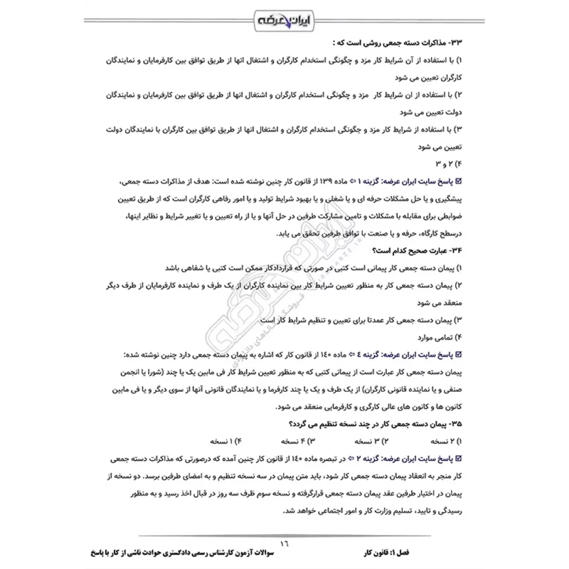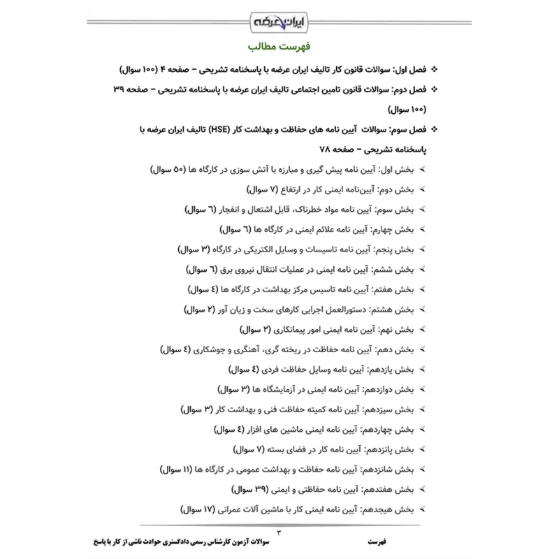 سوالات آزمون کارشناس رسمی دادگستری حوادث ناشی از کار تالیف ایران عرضه شامل 378 سوال با پاسخنامه تشریحی به شرح زیر: فصل 1: سوالات قانون کار تالیف ایران عرضه – صفحه 4 (100 سوال) فصل 2: سوالات قانون تامین اجتماعی تالیف ایران عرضه – صفحه 39 (100 سوال) فصل 3: سوالات آیین نامه های حفاظت و بهداشت کار (HSE) تالیف ایران عرضه – صفحه 78 بخش 1: آیین نامه پیش گیری و مبارزه با آتش سوزی در کارگاه ها (50 سوال) بخش 2: آییننامه ایمنی کار در ارتفاع (7 سوال) بخش 3: آیین نامه مواد خطرناک، قابل اشتعال و انفجار (6 سوال) بخش 4: آیین نامه علائم ایمنی در کارگاه ها (6 سوال) بخش 5: آیین نامه تاسیسات و وسایل الکتریکی در کارگاه (3 سوال) بخش 6: آیین نامه ایمنی در عملیات انتقال نیروی برق (6 سوال) بخش 7: آیین نامه تاسیس مرکز بهداشت در کارگاه ها (4 سوال) بخش 8: دستورالعمل اجرایی کارهای سخت و زیان آور (2 سوال) بخش 9: آیین نامه ایمنی امور پیمانکاری (2 سوال) بخش 10: آیین نامه حفاظت در ریخته گری، آهنگری و جوشکاری (4 سوال) بخش 11: آیین نامه وسایل حفاظت فردی (4 سوال) بخش 12: آیین نامه ایمنی در آزمایشگاه ها (3 سوال) بخش 13: آیین نامه کمیته حفاظت فنی و بهداشت کار (3 سوال) بخش 14: آیین نامه ایمنی ماشین های افزار (4 سوال) بخش 15: آیین نامه کار در فضای بسته (7 سوال) بخش 16: آیین نامه حفاظت و بهداشت عمومی در کارگاه ها (11 سوال) بخش 17: آیین نامه حفاظتی و ایمنی (39 سوال) بخش 18:آیین نامه ایمنی كار با ماشین آلات عمرانی (17 سوال) |