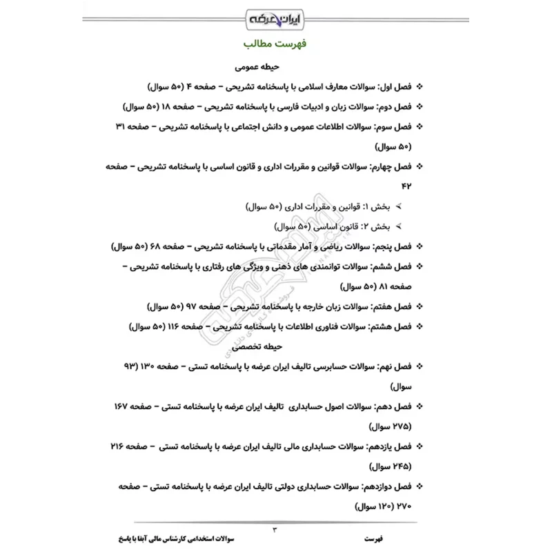 سوالات استخدامی کارشناس مالی آبفا شامل 1183 سوال با پاسخنامه تشریحی به شرح زیر: حیطه عمومی فصل 1: سوالات معارف اسلامی – صفحه 4 (50 سوال) فصل 2: سوالات زبان و ادبیات فارسی – صفحه 18 (50 سوال) فصل 3: سوالات اطلاعات عمومی و دانش اجتماعی – صفحه 31 (50 سوال) فصل 4: سوالات قوانین و مقررات اداری و قانون اساسی – صفحه 42 بخش 1: قوانین و مقررات اداری (50 سوال) بخش 2: قانون اساسی (50 سوال) فصل 5: سوالات ریاضی و آمار مقدماتی – صفحه 68 (50 سوال) فصل 6: سوالات توانمندی های ذهنی و ویژگی های رفتاری – صفحه 81 (50 سوال) فصل 7: سوالات زبان خارجه – صفحه 97 (50 سوال) فصل 8: سوالات فناوری اطلاعات – صفحه 116 (50 سوال) حیطه تخصصی فصل 9: سوالات حسابرسی تالیف ایران عرضه با پاسخنامه تستی – صفحه 130 (93 سوال) فصل 10: سوالات اصول حسابداری تالیف ایران عرضه با پاسخنامه تستی – صفحه 167 (275 سوال) فصل 11: سوالات حسابداری مالی تالیف ایران عرضه با پاسخنامه تستی – صفحه 216 (245 سوال) فصل 12: سوالات حسابداری دولتی تالیف ایران عرضه با پاسخنامه تستی – صفحه 270 (120 سوال) |