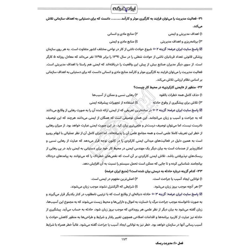 سوالات استخدامی کارشناس ایمنی آبفا شامل 728 سوال با پاسخنامه تشریحی به شرح زیر: حیطه عمومی فصل 1: سوالات معارف اسلامی - صفحه 5 (50 سوال) فصل 2: سوالات زبان و ادبیات فارسی - صفحه 19 (50 سوال) فصل 3: سوالات اطلاعات عمومی و دانش اجتماعی - صفحه 32 (50 سوال) فصل 4: سوالات قوانین و مقررات اداری و قانون اساسی - صفحه 43 بخش 1: قوانین و مقررات اداری (50 سوال) بخش 2: قانون اساسی (50 سوال) فصل 5: سوالات ریاضی و آمار مقدماتی - صفحه 69 (50 سوال) فصل 6: سوالات توانمندی های ذهنی و ویژگی های رفتاری - صفحه 82 (50 سوال) فصل 7: سوالات زبان خارجه - صفحه 98 (50 سوال) فصل 8: سوالات فناوری اطلاعات - صفحه 117 (50 سوال) حیطه تخصصی فصل 9: سوالات سوالات مدیریت بحران تالیف ایران عرضه - صفحه 131 (100 سوال) فصل 10: سوالات سوالات مدیریت ریسک تالیف ایران عرضه - صفحه 162 (100 سوال) فصل 11: سوالات مدیریت ریسک تالیف ایران عرضه - صفحه 202 (90 سوال) فصل 12: سوالات شناسایی عوامل فیزیکی زیان آور محیط کار تالیف ایران عرضه - صفحه 242 (44 سوال) فصل 13: سوالات شناسایی عوامل شیمیایی زیان آور محیط کار تالیف ایران عرضه - صفحه 257 (44 سوال) |