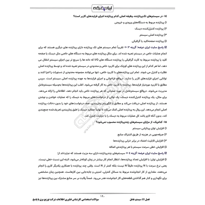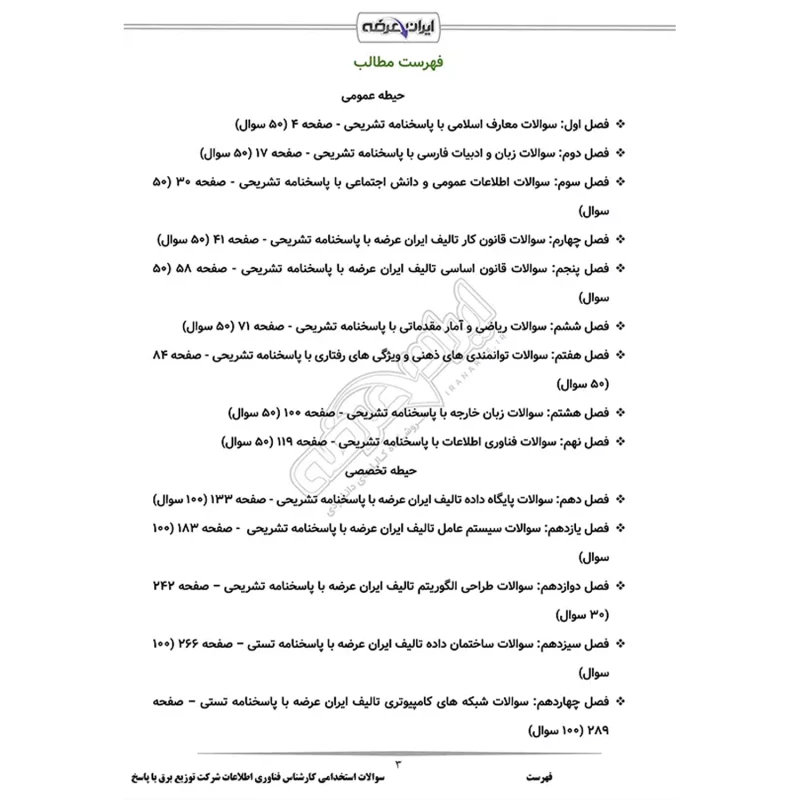 سوالات استخدامی کارشناس فناوری اطلاعات شرکت توزیع برق تالیف ایران عرضه شامل 880 سوال با پاسخنامه تشریحی به شرح زیر: حیطه عمومی فصل 1: سوالات معارف اسلامی - صفحه 4 (50 سوال) فصل 2: سوالات زبان و ادبیات فارسی - صفحه 17 (50 سوال) فصل 3: سوالات اطلاعات عمومی و دانش اجتماعی - صفحه 30 (50 سوال) فصل 4: سوالات قانون کار تالیف ایران عرضه - صفحه 41 (50 سوال) فصل 5: سوالات قانون اساسی تالیف ایران عرضه - صفحه 58 (50 سوال) فصل 6: سوالات ریاضی و آمار مقدماتی - صفحه 71 (50 سوال) فصل 7: سوالات توانمندی های ذهنی و ویژگی های رفتاری - صفحه 84 (50 سوال) فصل 8: سوالات زبان خارجه - صفحه 100 (50 سوال) فصل 9: سوالات فناوری اطلاعات - صفحه 119 (50 سوال) حیطه تخصصی فصل 10: سوالات پایگاه داده تالیف ایران عرضه - صفحه 133 (100 سوال) فصل 11: سوالات سیستم عامل تالیف ایران عرضه - صفحه 183 (100 سوال) فصل 12: سوالات طراحی الگوریتم تالیف ایران عرضه – صفحه 242 (30 سوال) فصل 13: سوالات ساختمان داده تالیف ایران عرضه با پاسخنامه تستی – صفحه 266 (100 سوال) فصل 14: سوالات شبکه های کامپیوتری تالیف ایران عرضه با پاسخنامه تستی – صفحه 289 (100 سوال) |