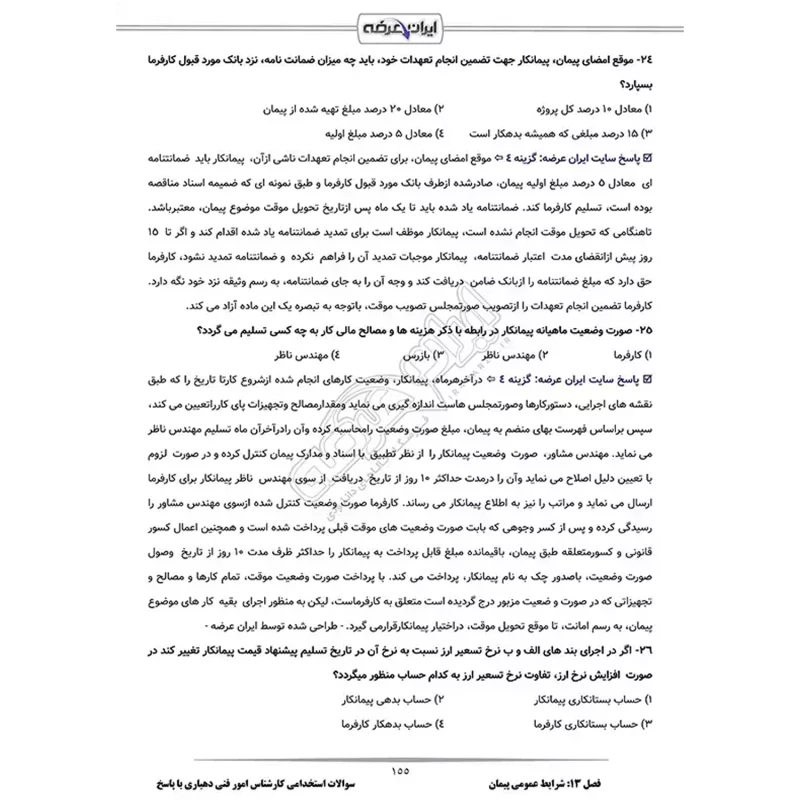 سوالات استخدامی کارشناس امور فنی دهیاری شامل 523 سوال با پاسخنامه تشریحی به شرح زیر: حیطه عمومی فصل 1: سوالات فناوری اطلاعات - صفحه 4 (50 سوال) فصل 2: سوالات ریاضی و آمار مقدماتی - صفحه 17 (50 سوال) فصل 3: سوالات زبان و ادبیات فارسی - صفحه 30 (50 سوال) فصل 4: سوالات معارف اسلامی - صفحه 43 (50 سوال) فصل 5: سوالات زبان انگلیسی عمومی - صفحه 57 (50 سوال) فصل 6: سوالات اطلاعات عمومی، دانش اجتماعی - صفحه 73 (50 سوال) فصل 7: سوالات توانمنتدی های ذهنی و ویژگی های رفتاری با - صفحه 85 (50 سوال) فصل 8: سوالات قانون تاسیس دهیاری های خودکفا - صفحه 100 (15 سوال) حیطه تخصصی فصل 9: سوالات مقررات ملی ساختمان مبحث 4 (الزامات عمومی ساختمان) تالیف ایران عرضه - صفحه 105 (20 سوال) فصل 10: سوالات مقررات ملی ساختمان مبحث 5 (مصالح و فرآورده های ساختمانی) تالیف ایران عرضه - صفحه 114 (50 سوال) فصل 11: سوالات مقررات ملی ساختمان مبحث 8 (طرح و اجرای ساختمان های با مصالح بنایی) تالیف ایران عرضه - صفحه 127 (21 سوال) فصل 12: سوالات مقررات ملی ساختمان مبحث 12 ( ایمنی و حفاظت کار در حین اجرا ) تالیف ایران عرضه - صفحه 136 (23 سوال) فصل 13: سوالات شرایط عمومی پیمان تالیف ایران عرضه - صفحه 148 (30 سوال) فصل 14: سوالات شرایط خصوصی پیمان تالیف ایران عرضه - صفحه 158 (14 سوال) |