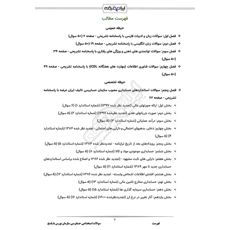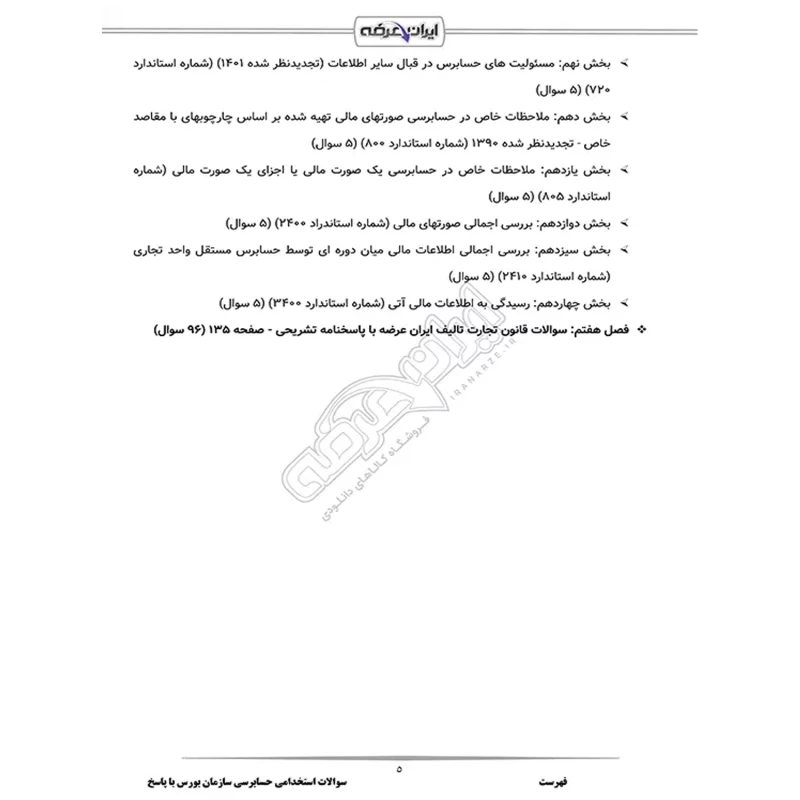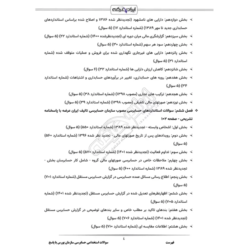 سوالات استخدامی حسابرسی سازمان بورس شامل 465 سوال با پاسخنامه تشریحی به شرح زیر: حیطه عمومی فصل 1: سوالات زبان و ادبیات فارسی - صفحه 6 (50 سوال) فصل 2: سوالات زبان انگلیسی - صفحه 19 (50 سوال) فصل 3: سوالات توانمندی های ذهنی و ویژگی های رفتاری - صفحه 34 (50 سوال) فصل 4: سوالات فناوری اطلاعات (مهارت های هفتگانه ICDL) - صفحه 49 (50 سوال) حیطه تخصصی فصل 5: سوالات استانداردهای حسابداری مصوب سازمان حسابرسی تالیف ایران عرضه - صفحه 62 بخش 1: ارائه صورتهای مالی (تجدید نظر شده 1397) (شماره استاندارد 1) (6 سوال) بخش 2: صورت جریانهای نقدی (تجدید نظرشده 1397) (شماره استاندارد 2) (5 سوال) بخش 3: درآمد عملیاتی (شماره استاندارد 3) (5 سوال) بخش 4: ذخایر، بدهیهای احتمالی و دارایی های احتمالی - تجدید نظر شده 1384 (شماره استاندارد 4) (5 سوال) بخش 5: رویدادهای بعد از تاریخ ترازنامه - تجدیدنظر شده 1384 (شماره استاندارد 5) (5 سوال) بخش 6: حسابداری موجودی مواد و کالا (شماره استاندارد 8) (5 سوال) بخش 7: دارایی های ثابت مشهود - (تجدید نظر شده 1386 و اصلاح شده براساس استانداردهای حسابداری جدید تا مهر 1389 (شماره استاندارد 11) (5 سوال) بخش 8: افشای اطلاعات اشخاص وابسته - تجدید نظر شده 1386 (شماره استاندارد 12) (5 سوال) بخش 9: حسابداری مخارج تامین مالی (شماره استاندارد 13) (5 سوال) بخش 10: حسابداری سرمایه گذاری ها (شماره استاندارد 15) (5 سوال) بخش 11: آثار تغییر در نرخ ارز (تجدیدنظرشده 1400) (شماره استاندارد 16) (5 سوال) بخش 12: دارایی های نامشهود (تجدیدنظر شده 1386 و اصلاح شده براساس استانداردهای حسابداری جدید تا مهر 1389) (شماره استاندارد 17) (5 سوال) بخش 13: گزارشگری مالی میان دوره ای (تجدیدنظرشده 1400) (شماره استاندارد 22) (5 سوال) بخش 14: سود هر سهم (شماره استاندارد 30) (5 سوال) بخش 15: دارایی های غیرجاری نگهداری شده برای فروش و عملیات متوقف شده (شماره استاندارد 31) (5 سوال) بخش 16: کاهش ارزش دارایی ها (شماره استاندارد 32) (6 سوال) بخش 17: رویه های حسابداری، تغییر در برآوردهای حسابداری و اشتباهات (شماره استاندارد 34) (5 سوال) بخش 18: ترکیب های تجاری (مصوب 1398) (شماره استاندارد 38) (5 سوال) بخش 19: صورتهای مالی تلفیقی (مصوب 1398) (شماره استاندارد 39) (5 سوال) فصل 6: سوالات استانداردهای حسابرسی مصوب سازمان حسابرسی تالیف ایران عرضه با پاسخنامه تشریحی - صفحه 102 بخش 1: اشخاص وابسته - تجدیدنظر شده 1389 (شماره استاندارد 550) (5 سوال) بخش 2: رویدادهای پس از تاریخ صورتهای مالی - تجدید نظر شده 1396 (شماره استاندارد 560) (5 سوال) بخش 3: تداوم فعالیت (تجدیدنظر شده 1401) (شماره استاندارد 570) (5 سوال) بخش 4: ملاحظات خاص در حسابرسی صورتهای مالی گروه - شامل کار حسابرسان بخش - تجدیدنظر شده 1389 (شماره استاندارد 600) (5 سوال) بخش 5: اطلاع رسانی مسائل عمده حسابرسی در گزارش حسابرس مستقل (شماره استاندارد 701) (5 سوال) بخش 6: اظهارنظرهای تعدیل شده در گزارش حسابرس مستقل (تجدیدنظر شده 1401) (شماره استاندارد 705) (5 سوال) بخش 7: بندهای تاکید بر مطلب خاص و سایر بندهای توضیحی در گزارش حسابرس مستقل (تجدیدنظر شده 1401) (شماره استاندارد 706) (5 سوال) بخش 8: اطلاعات مقایسه ای (شماره استاندارد 710) (5 سوال) بخش 9: مسئولیت های حسابرس در قبال سایر اطلاعات (تجدیدنظر شده 1401) (شماره استاندارد 720) (5 سوال) بخش 10: ملاحظات خاص در حسابرسی صورتهای مالی تهیه شده بر اساس چارچوبهای با مقاصد خاص - تجدیدنظر شده 1390 (شماره استاندارد 800) (5 سوال) بخش 11: ملاحظات خاص در حسابرسی یک صورت مالی یا اجزای یک صورت مالی (شماره استاندارد 805) (5 سوال) بخش 12: بررسی اجمالی صورتهای مالی (شماره استاندراد 2400) (5 سوال) بخش 13: بررسی اجمالی اطلاعات مالی میان دوره ای توسط حسابرس مستقل واحد تجاری (شماره استاندارد 2410) (5 سوال) بخش 14: رسیدگی به اطلاعات مالی آتی (شماره استاندارد 3400) (5 سوال) فصل 7: سوالات قانون تجارت تالیف ایران عرضه - صفحه 135 (96 سوال) |