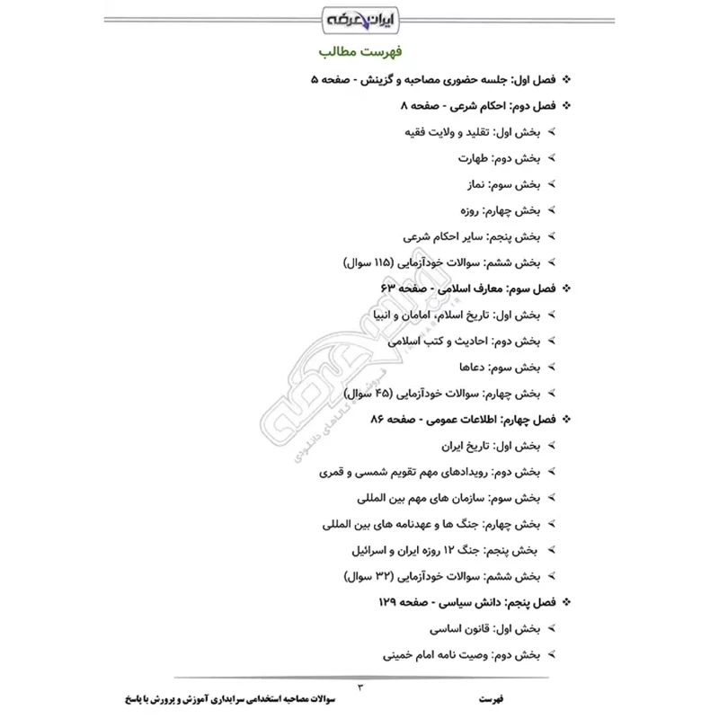 سوالات مصاحبه سرایداری آموزش و پرورش با پاسخ شامل 407 سوال با پاسخنامه تشریحی به شرح زیر: فصل 1: جلسه حضوری مصاحبه و گزینش - صفحه 5 فصل 2: احکام شرعی - صفحه 8 بخش 1: تقلید و ولایت فقیه بخش 2: طهارت بخش 3: نماز بخش 4: روزه بخش 5: سایر احکام شرعی بخش 6: سوالات خودآزمایی (115 سوال) فصل 3: معارف اسلامی - صفحه 63 بخش 1: تاریخ اسلام، امامان و انبیا بخش 2: احادیث و کتب اسلامی بخش 3: دعاها بخش 4: سوالات خودآزمایی (45 سوال) فصل 4: اطلاعات عمومی - صفحه 86 بخش 1: تاریخ ایران بخش 2: رویدادهای مهم تقویم شمسی و قمری بخش 3: سازمان های مهم بین المللی بخش 4: جنگ ها و عهدنامه های بین المللی بخش 5: جنگ 12 روزه ایران و اسرائیل بخش 6: سوالات خودآزمایی (32 سوال) فصل 5: دانش سیاسی - صفحه 129 بخش 1: قانون اساسی بخش 2: وصیت نامه امام خمینی بخش 3: شهدای نامدار بخش 4: انقلاب اسلامی ایران بخش 5: بیانیه گام دوم انقلاب اسلامی بخش 6: سوالات خودآزمایی (100 سوال) فصل 6: مباحث روانشناختی - صفحه 227 فصل 7: قرآن کریم - صفحه 232 بخش 1: اطلاعات قرآنی بخش 2: روخوانی و روان خوانی قرآن کریم بخش 3: سوالات خودآزمایی (25 سوال) فصل 8: سوالات برگرفته از تجربیات داوطلبان در مصاحبه - صفحه 253 (90 سوال) فصل 9: آشنایی با مصاحبه سرایداری - صفحه 271 |
