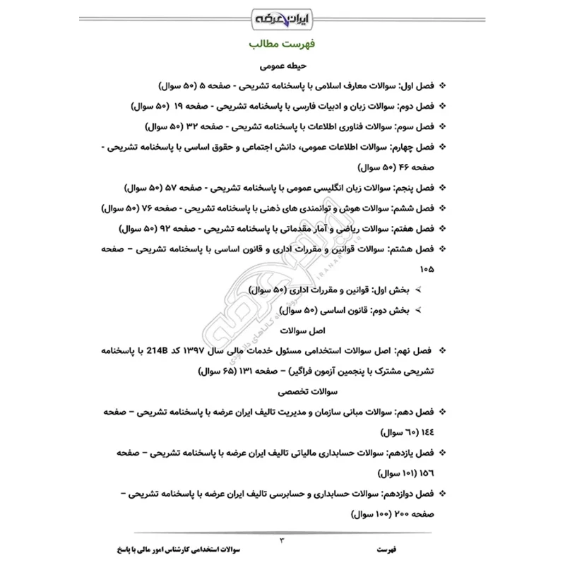 سوالات استخدامی کارشناس امور مالی شامل 2266 سوال با پاسخنامه به شرح زیر: حیطه عمومی فصل 1: سوالات معارف اسلامی - صفحه 5 (50 سوال) فصل 2: سوالات زبان و ادبیات فارسی - صفحه 19 (50 سوال) فصل 3: سوالات فناوری اطلاعات - صفحه 32 (50 سوال) فصل 4: سوالات اطلاعات عمومی، دانش اجتماعی و حقوق اساسی - صفحه 46(50 سوال) فصل 5: سوالات زبان انگلیسی عمومی - صفحه 57 (50 سوال) فصل 6: سوالات هوش و توانمندی های ذهنی - صفحه 76 (50 سوال) فصل 7: سوالات ریاضی و آمار مقدماتی - صفحه 92 (50 سوال) فصل 8: سوالات قوانین و مقررات اداری و قانون اساسی – صفحه 105 بخش اول: قوانین و مقررات اداری (50 سوال) بخش دوم: قانون اساسی (50 سوال) اصل سوالات فصل 9: اصل سوالات استخدامی مسئول خدمات مالی سال 1397 کد 214B مشترک با پنجمین آزمون فراگیر) – صفحه 131 (65 سوال) سوالات تخصصی فصل 10: سوالات مبانی سازمان و مدیریت – صفحه 144 (60 سوال) فصل 11: سوالات حسابداری مالیاتی – صفحه 156 (101 سوال) فصل 12: سوالات حسابداری و حسابرسی – صفحه 200 (100 سوال) فصل 13: سوالات آمار و احتمال – صفحه 236 (55 سوال) فصل 14: سوالات ریاضی و آمار – صفحه 259 (100 سوال) فصل 15: سوالات حسابداری دولتی و بودجه با پاسخنامه تستی – صفحه 274 (120 سوال) فصل 16: سوالات حسابداری مالی با پاسخنامه تستی – صفحه 292 (105 سوال) فصل 17: سوالات اصول حسابداری با پاسخنامه تستی – صفحه 307 (45 سوال) فصل 18: سوالات مدیریت مالی با پاسخنامه تستی– صفحه 323 (285 سوال) فصل 19: سوالات مبانی سازمان و مدیریت با پاسخنامه تستی – صفحه 366 (285 سوال) فصل 20: سوالات حسابداری صنعتی با پاسخنامه تستی – صفحه 405 (195 سوال) فصل 21: سوالات اصول تنظیم و کنترل بودجه با پاسخنامه تستی – صفحه 450 (300 سوال) |