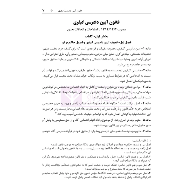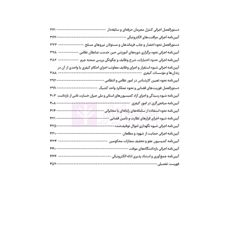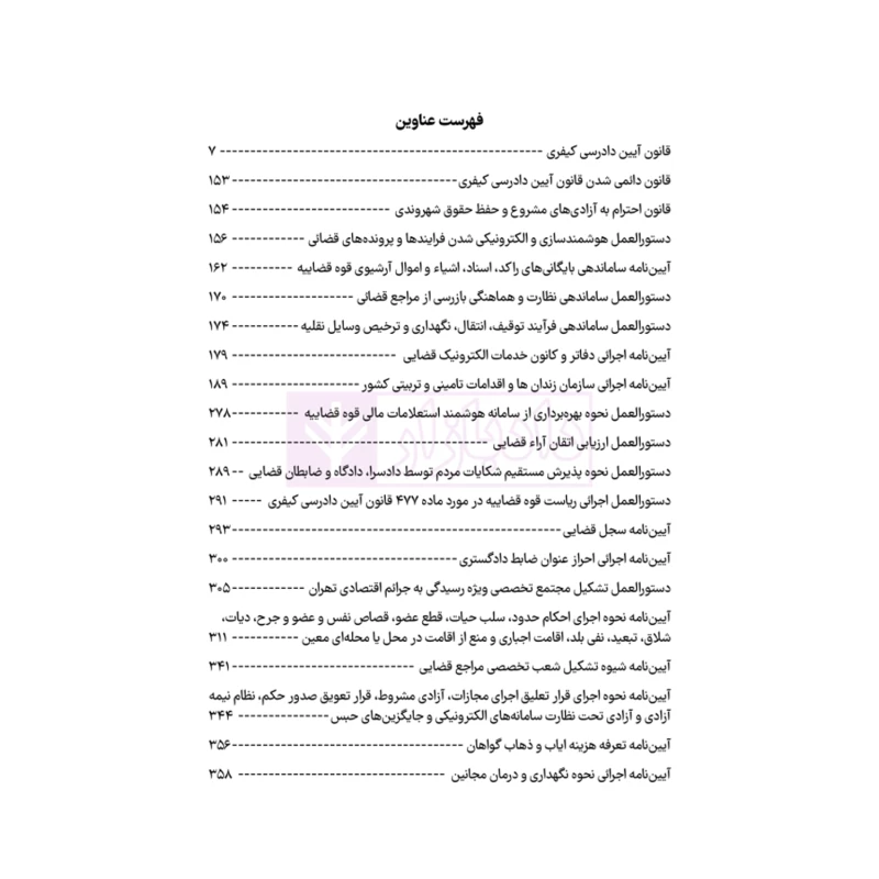 - کتاب حاضر شامل قانون آیین دادرسی کیفری مصوب 1392 و کلیهٔ آیین نامه ها، دستورالعمل ها و ... با زیرنویس تنقیحی