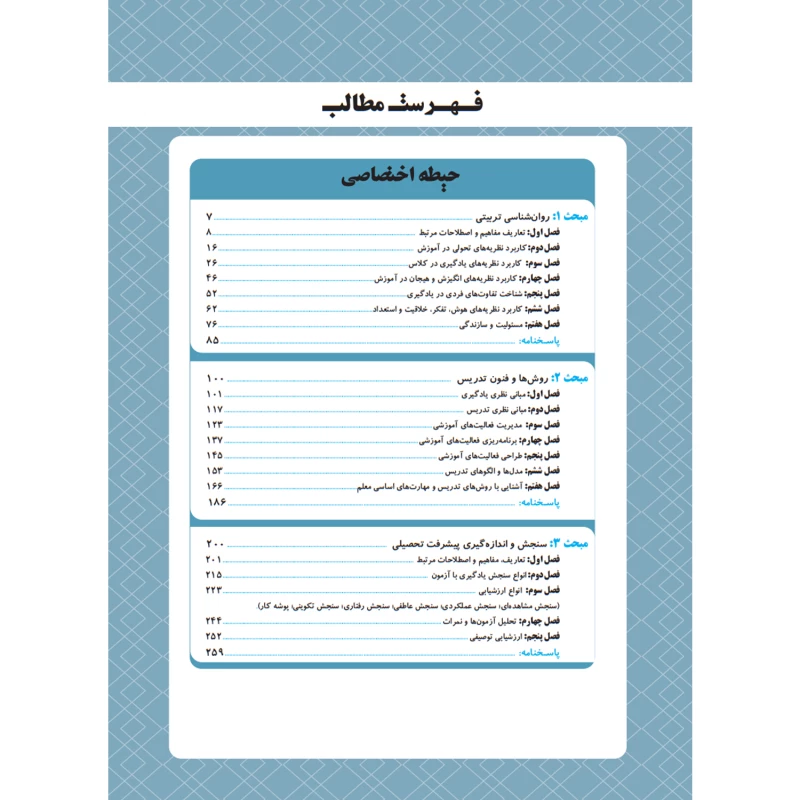 پاسخشامل سه جلد کتاب (حیطه عمومی، اختصاصی و تخصصی) هست که هم درسنامه داره هم سوالات تست